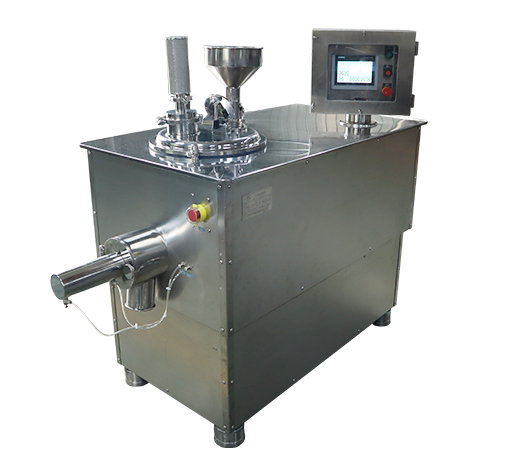 本機用于制藥工業(yè)中的固體制劑生產(chǎn),集傳統(tǒng)制粒工藝中的混合和制粒兩道工序與一體同時進行,其制粒過程是先把粉料投入料筒內(nèi)經(jīng)攪拌漿形成翻滾狀態(tài),使不同性質(zhì)的粉料得到徹底的混合,然后逐量加入粘合劑。(通過攪拌漿和筒壁對物料的擠壓、揉合,使其形成潮濕均勻的軟材,同時經(jīng)制粒刀片的高速切割,逐步形成大小均勻的顆粒,最后由出料口排出,顆粒目數(shù)的大小由制粒刀的轉速和制粒時間控制)。